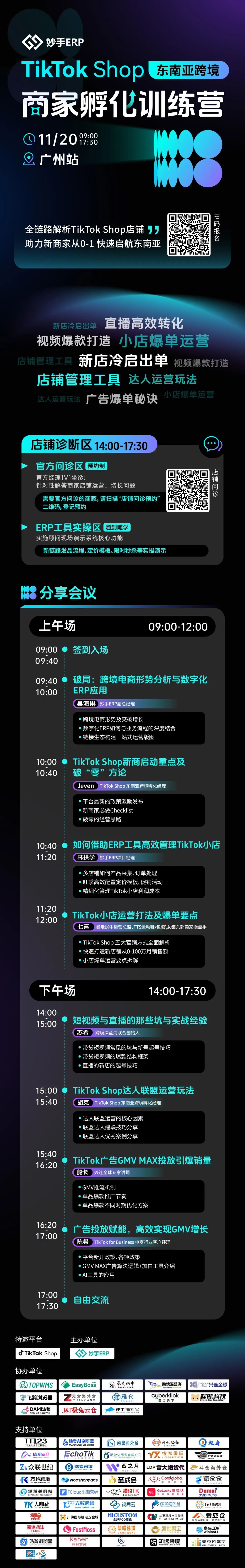 为此,在2025年11月20日(周四),妙手ERP将联合TikTok Shop官方,于广州站举办TikTok Shop商家孵化训练营,全方位解析店铺运营链路,助力新商家从0-1快速启航东南亚。