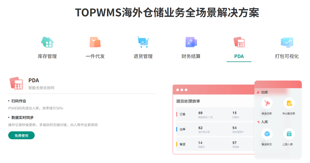 海外仓库存盘亏的处理,本质上是库存管理能力的体现。想要从根源上解决库存问题,必须掌握科学的海外仓库存管理方法,而TOPWMS系统正是这些方法落地的核心工具,其功能覆盖库存规划、入库、存储、出库、盘点全流程,让库存管理更高效、精准。