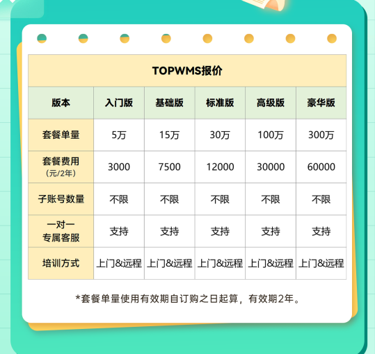 TOPWMS采用按单计费的模式,单笔订单处理成本低至0.02元,且所有套餐均支持2年使用期,无隐藏费用。