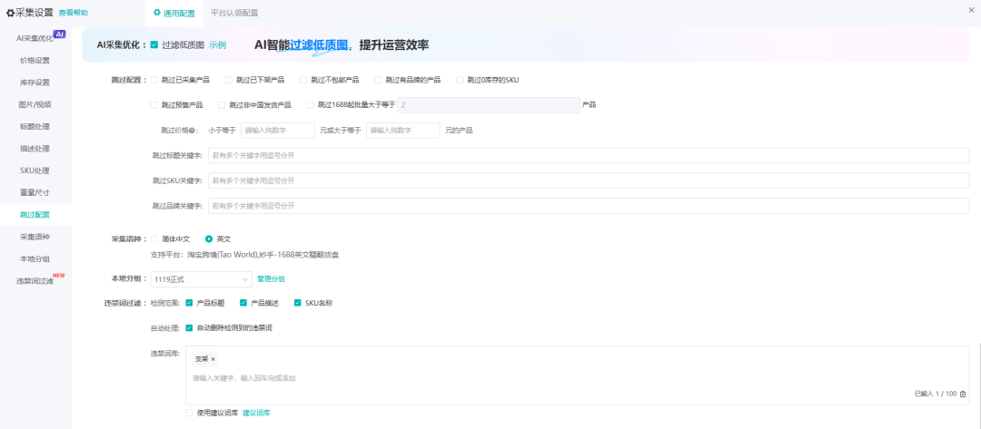 在品牌专利方面,可以将在第三方品牌查询工具筛选出的侵权词,录入妙手ERP的跳过设置或者违禁词库中,系统会在采集商品时自动拦截含侵权链接。