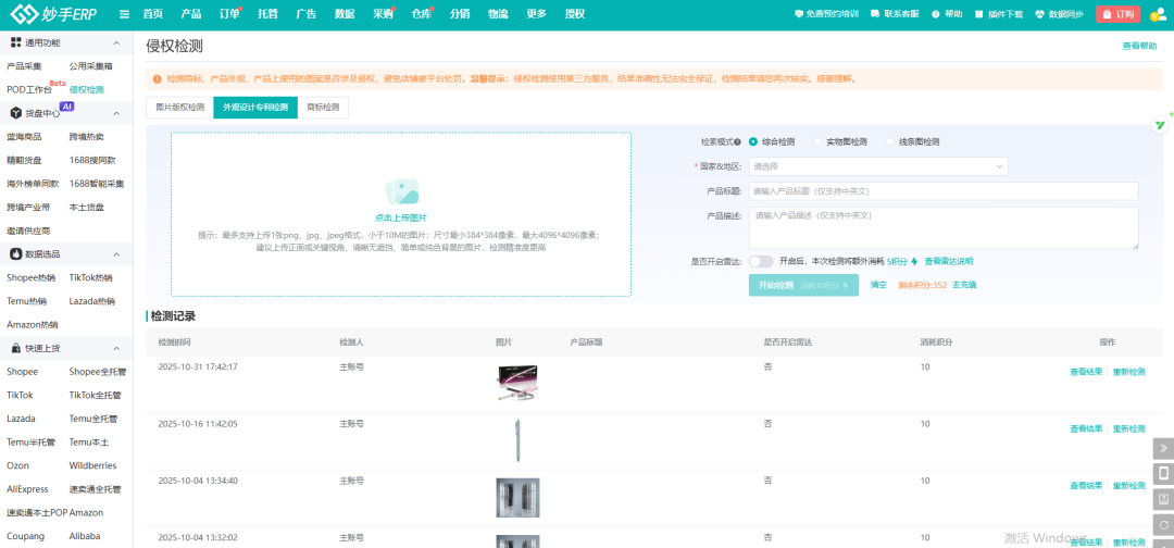 像妙手ERP的侵权检测功能,就可从商标、外观设计和图片等方面,一键检测侵权行为,提前规避合规难题。
