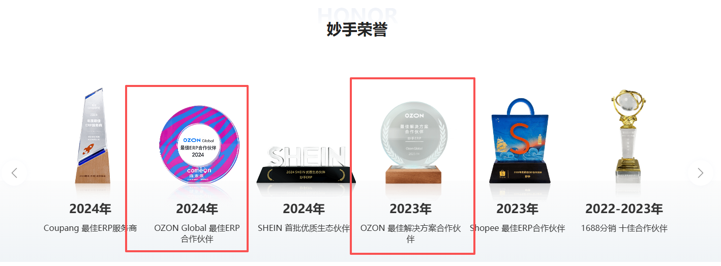 1、它可是连续多年拿过Ozon官方奖项的,既是Ozon最佳解决方案合作伙伴,还获评过Ozon Global最佳ERP合作伙伴,有平台官方背书,用着绝对放心,不用担心出现兼容性问题或者账号风险。