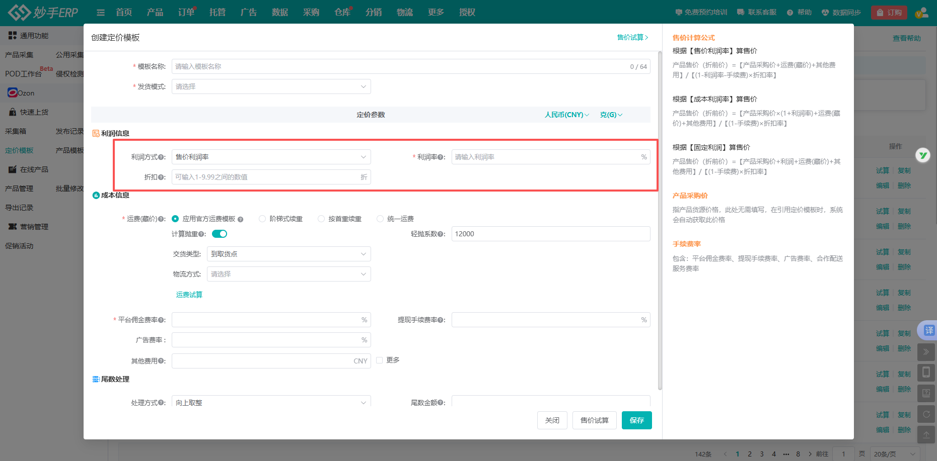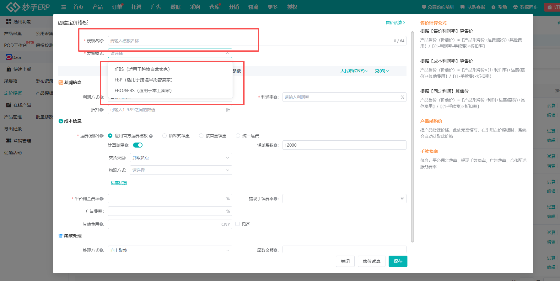 (2)然后点击创建模板,即可开始创建自己的Ozon定价模板。