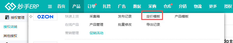 (1)进入【产品】模块,选择Ozon定价模板页面。