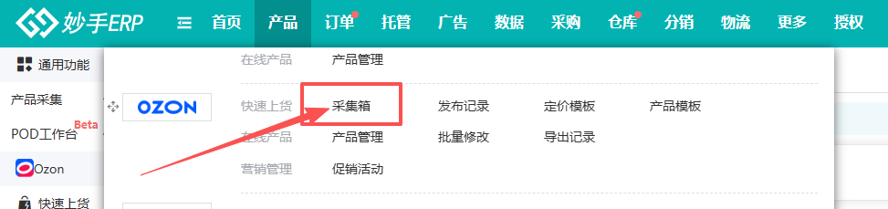 (1)最后,进入【产品】的Ozon采集箱页面。