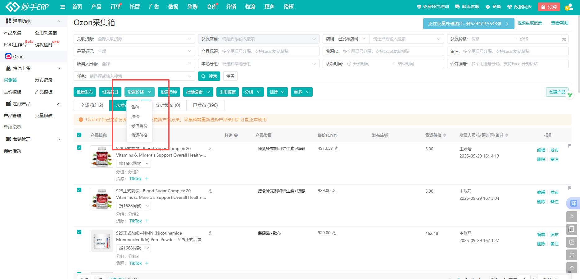 (2)需要改价的产品,即可批量勾选目标产品,点击【设置价格】,选择需要修改的价格类型。