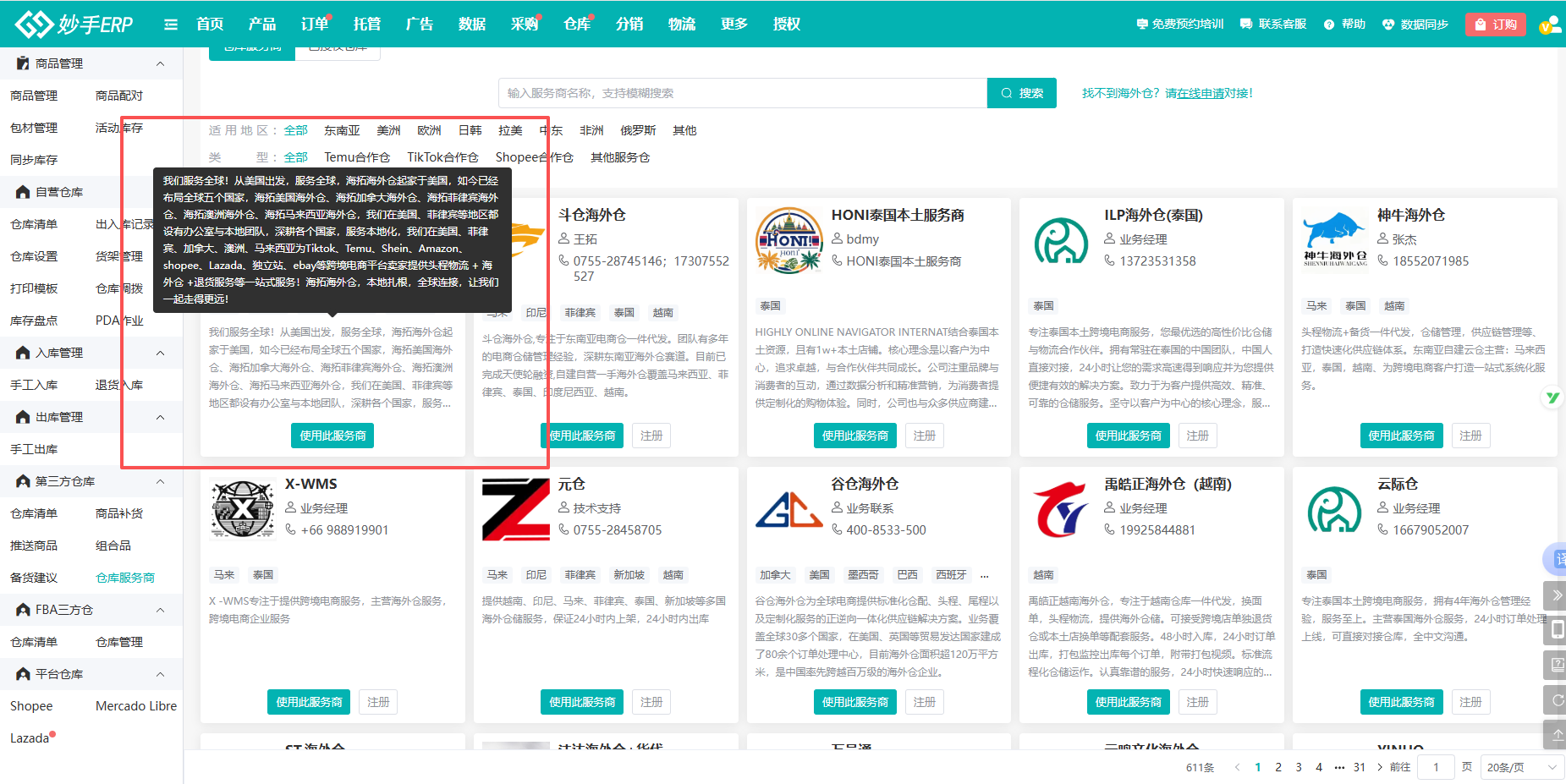 (4)这里可以按目标地区选(比如做东南亚就选东南亚仓,做俄罗斯就选俄罗斯仓),还能按平台选Temu合作仓、TikTok合作仓、Shopee合作仓等。每个服务商都有详细介绍,包括联系方式、核心优势,比如ILP泰国海外仓有常驻中国团队,24小时中文对接;海拓海外仓覆盖美国、加拿大、菲律宾等五个国家,支持多平台发货。看中后直接点击“使用此服务商”注册授权,可直接在妙手ERP内进行授权,半天就能搞定海外仓对接,省去大量沟通成本,为后续的库存调用与订单处理奠定系统对接基础。