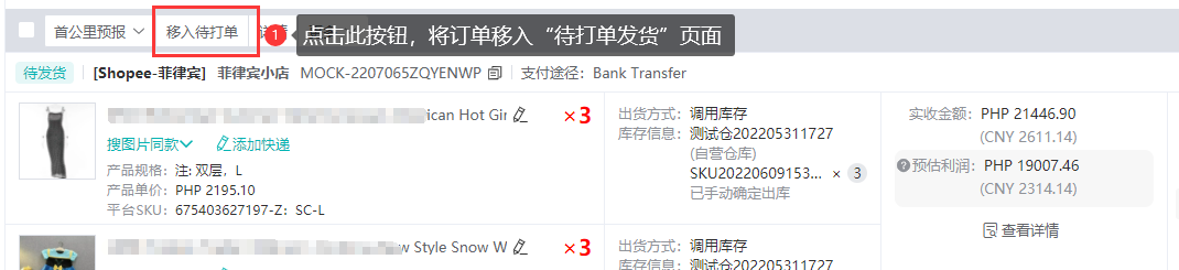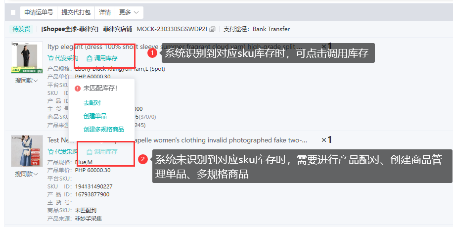 在待处理订单中,系统会自动识别该平台sku是否有可调用的库存商品。