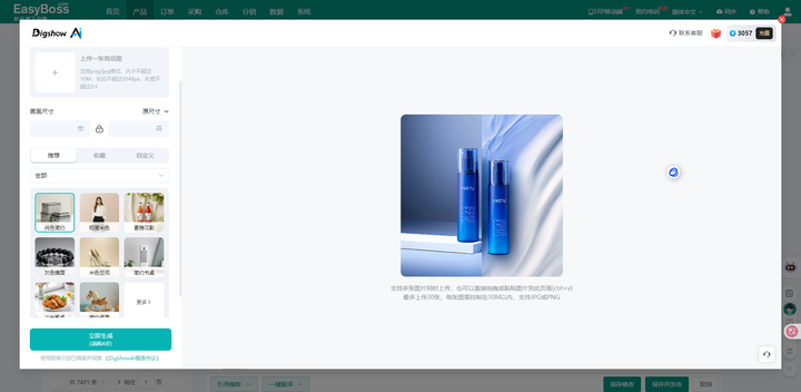 提供商品的正面、侧面、背面、特写等多角度图片,还可添加模特上身效果图或使用场景图,帮助消费者全面了解商品。使用EasyBoss内嵌的作图工具可以一键AI生成商品图,还支持AI模特换脸。