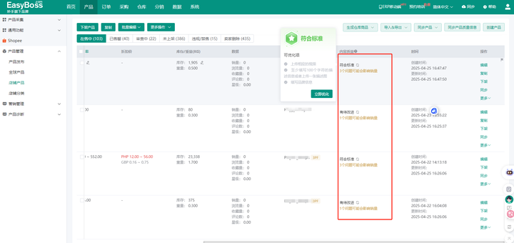 持续维护并检查shopee商品列表有助于卖家发现listing的问题,及时优化,对于多店铺运营,且Shopee店铺SPU多的卖家,可以直接通过EasyBoss的产品模块,接入了Shopee官方产品内容质量检测接口,快速查看需要优化Listing,一键跳转优化。