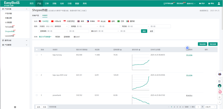 借助 Shopee 平台的数据分析工具,掌握目标市场消费者的搜索习惯与热门关键词,比如EasyBoss ERP的Shopee热搜词模块,同时参考竞争对手的标题,精准挑选出与商品紧密相关且搜索量大的关键词。