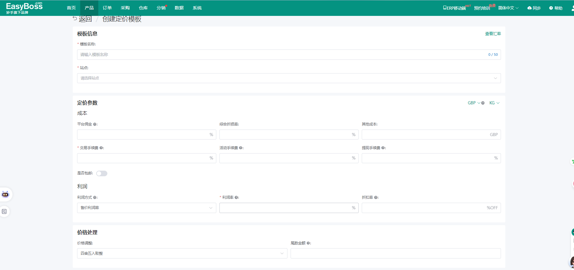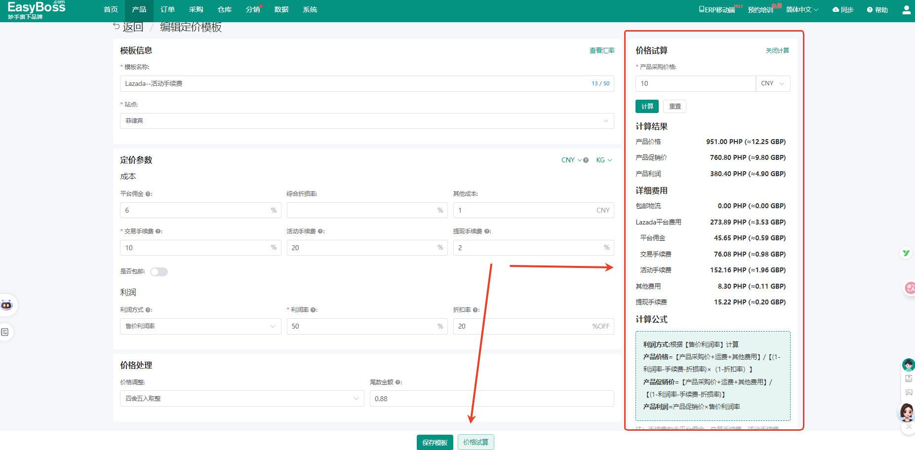 考虑到Lazada本土店不同站店的佣金、费率、税费都有不同,而且各国的仓储成本、运输成本也不一样,不同类目的产品也有所差异,此外还有一些Lazada卖家同时运营运营shopee\Tiktok小店,因此更建议使用第三方定价计算器去设置定价,例如EasyBoss ERP的定价模板,这是一个结合了运费成本、交易成本等多个价格因素,帮助卖家快速设定售价的工具。