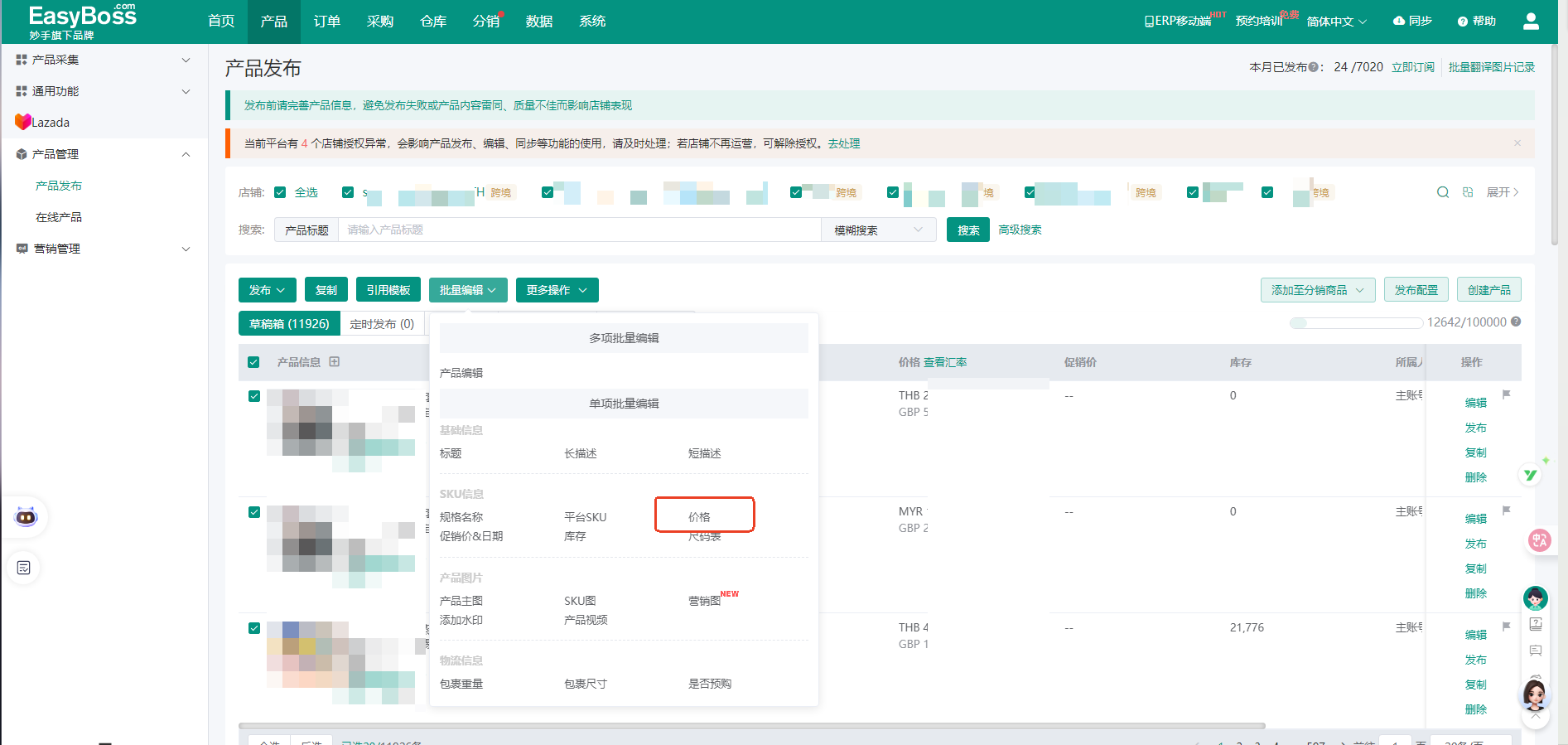 保存后,在产品编辑时,可一键引用模板修改价格。