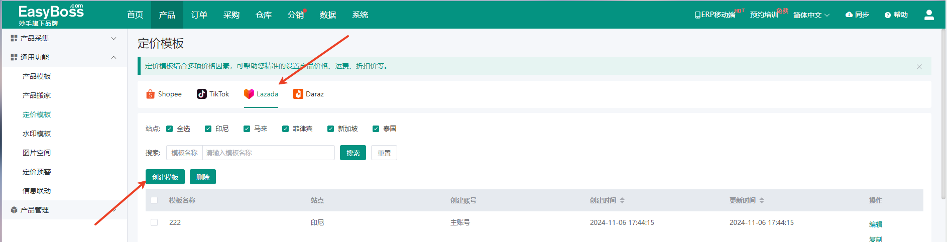 1.在EasyBoss ERP的定价模板功能中,选中Lazada平台,点击创建模板
