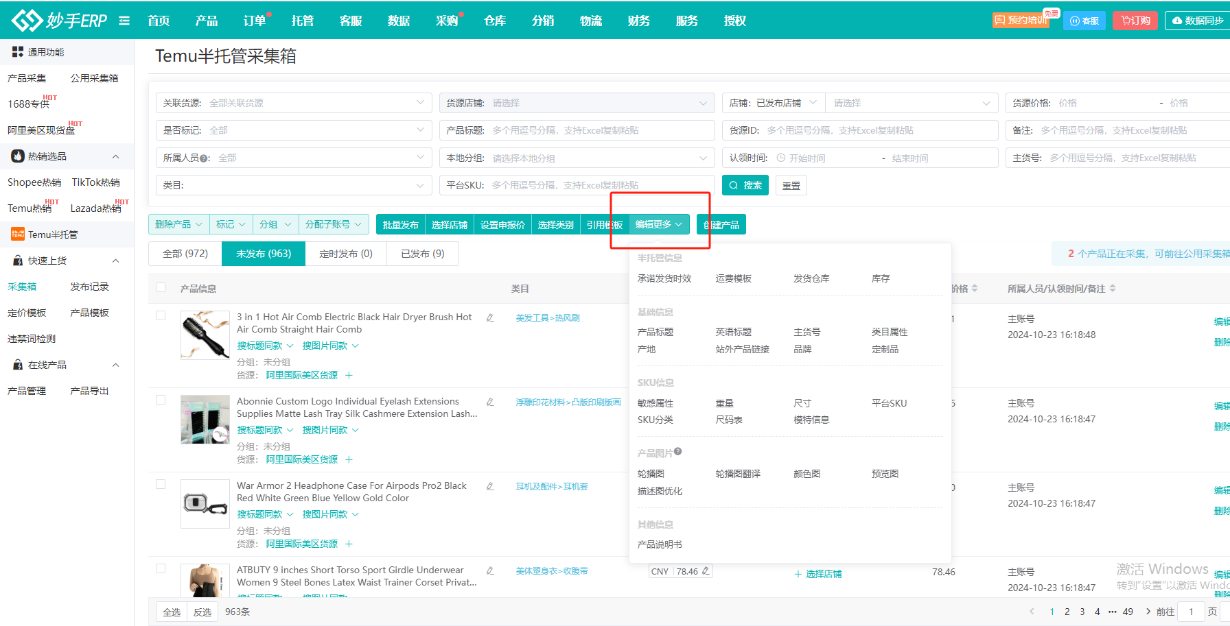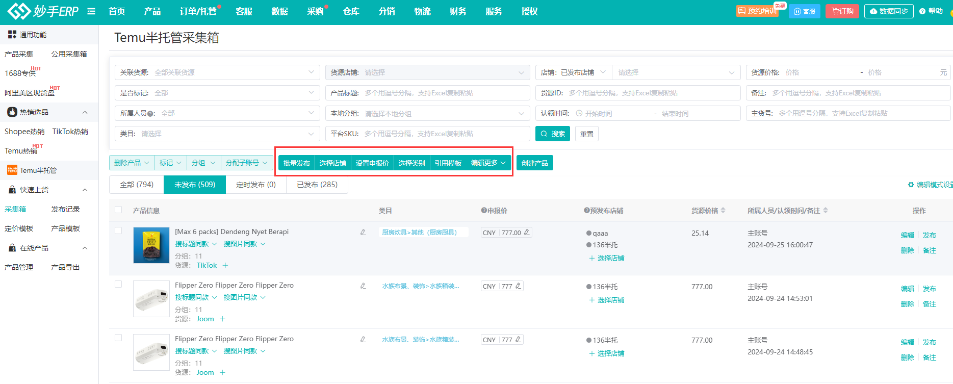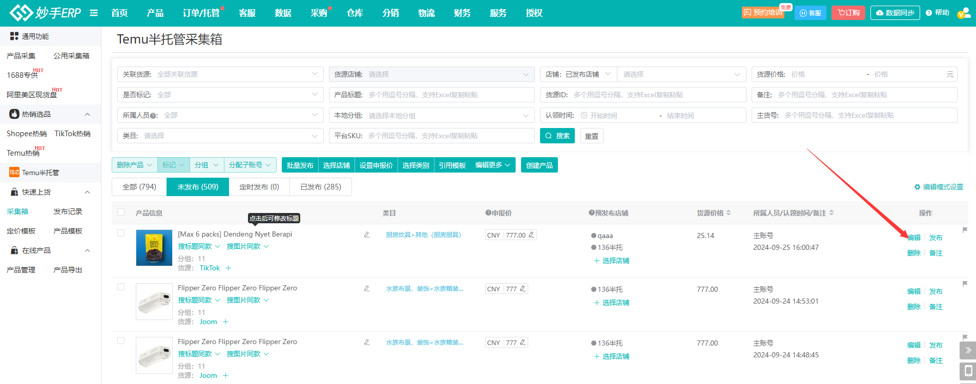 后续再前往TEMU平台产品发布(采集箱)的位置,即可编辑产品并上架到自己的temu店铺。
