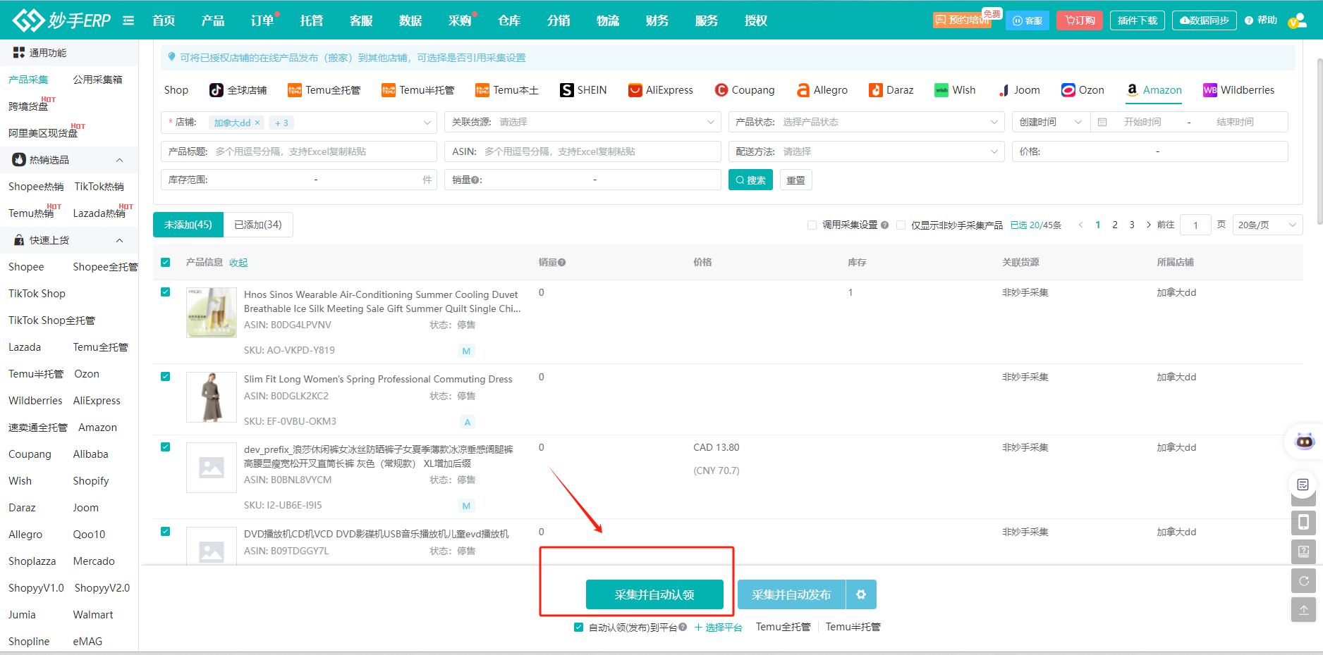 4. 搜索结果出来后,勾选需要搬运的产品,点击采集并自动认领
