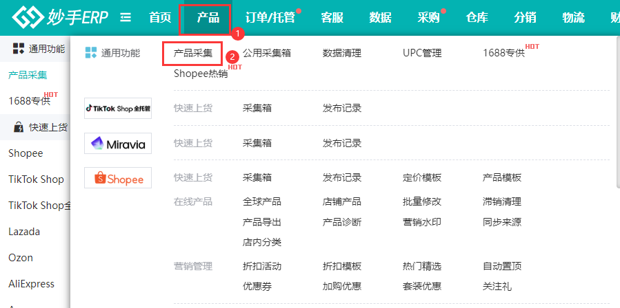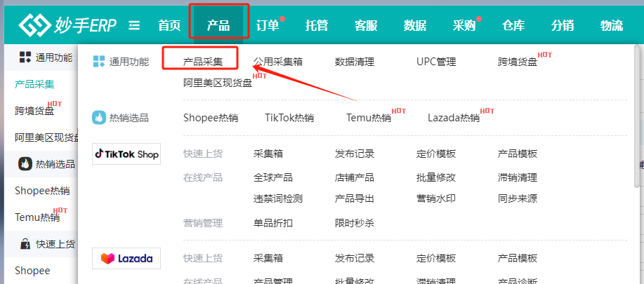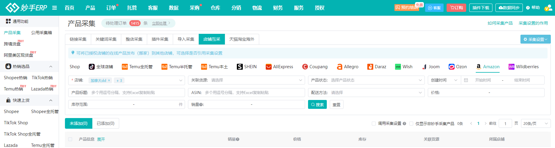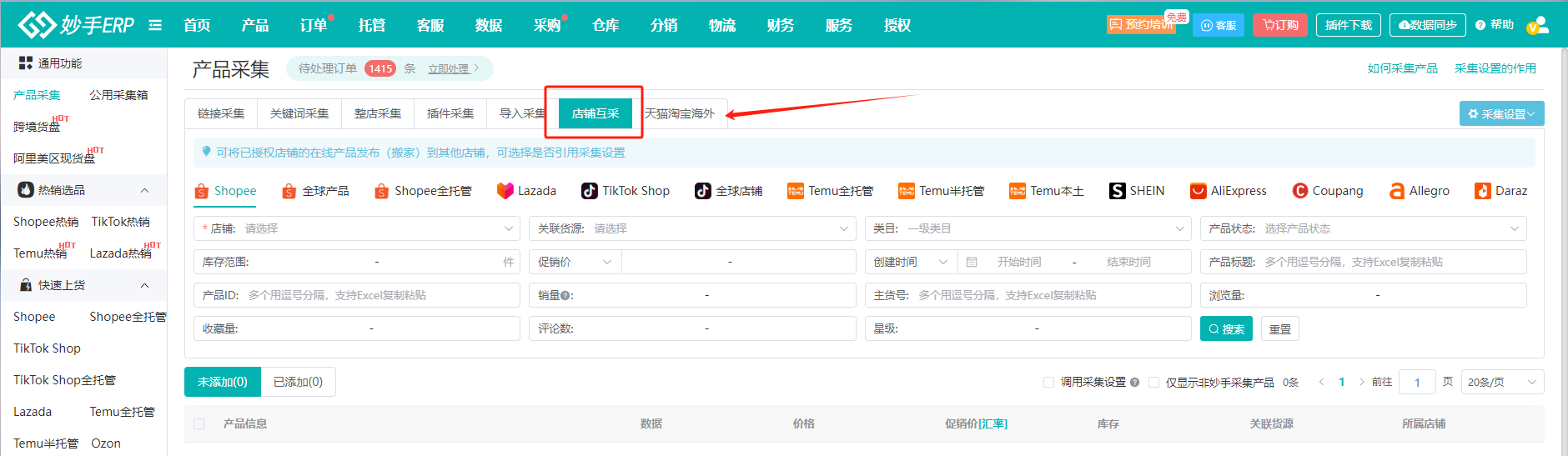 2. 点击产品-产品采集,进入页面后,点击店铺互采