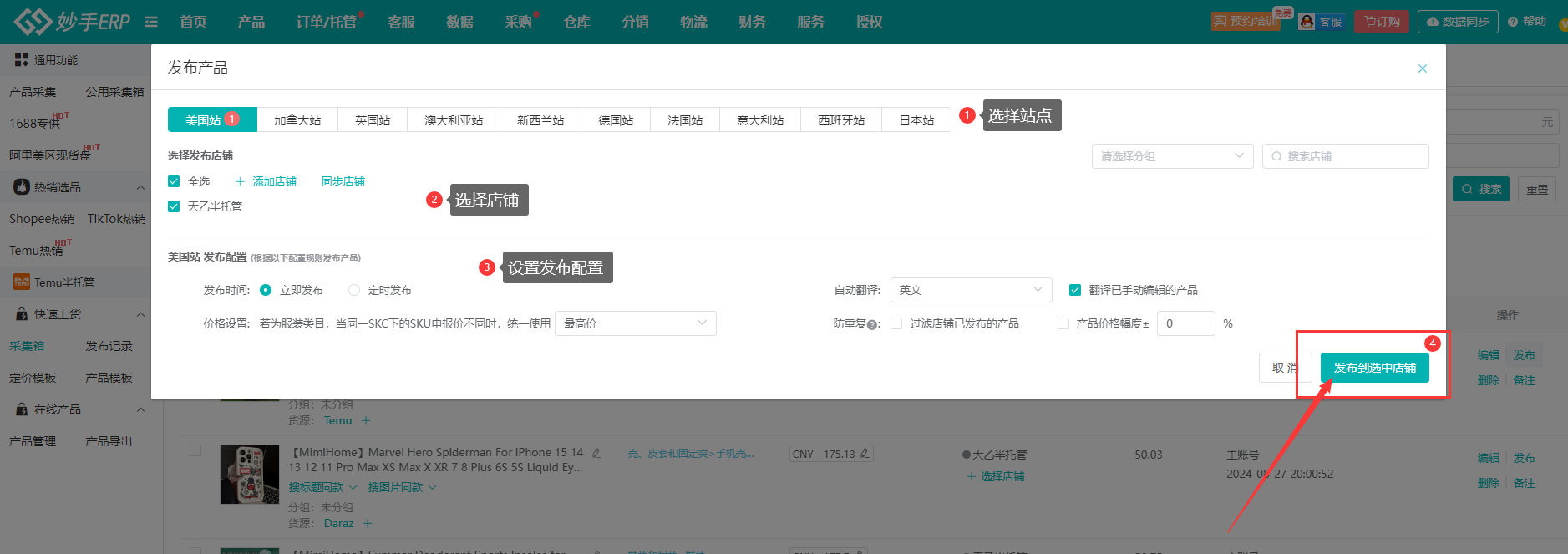 2. 用ERP软件的搬家功能把自己Amazon亚马逊店铺的产品Listing一键搬家到自己的temu店铺。