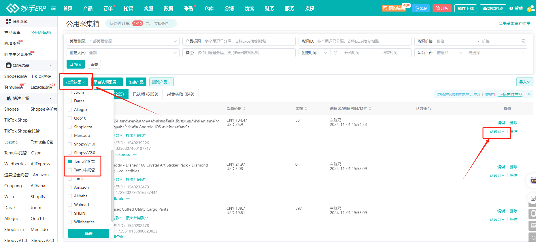 产品完成采集后,会进入到公用采集箱,进入公用采集箱后,可将刚才采集的产品认领到自己的Temu采集箱
