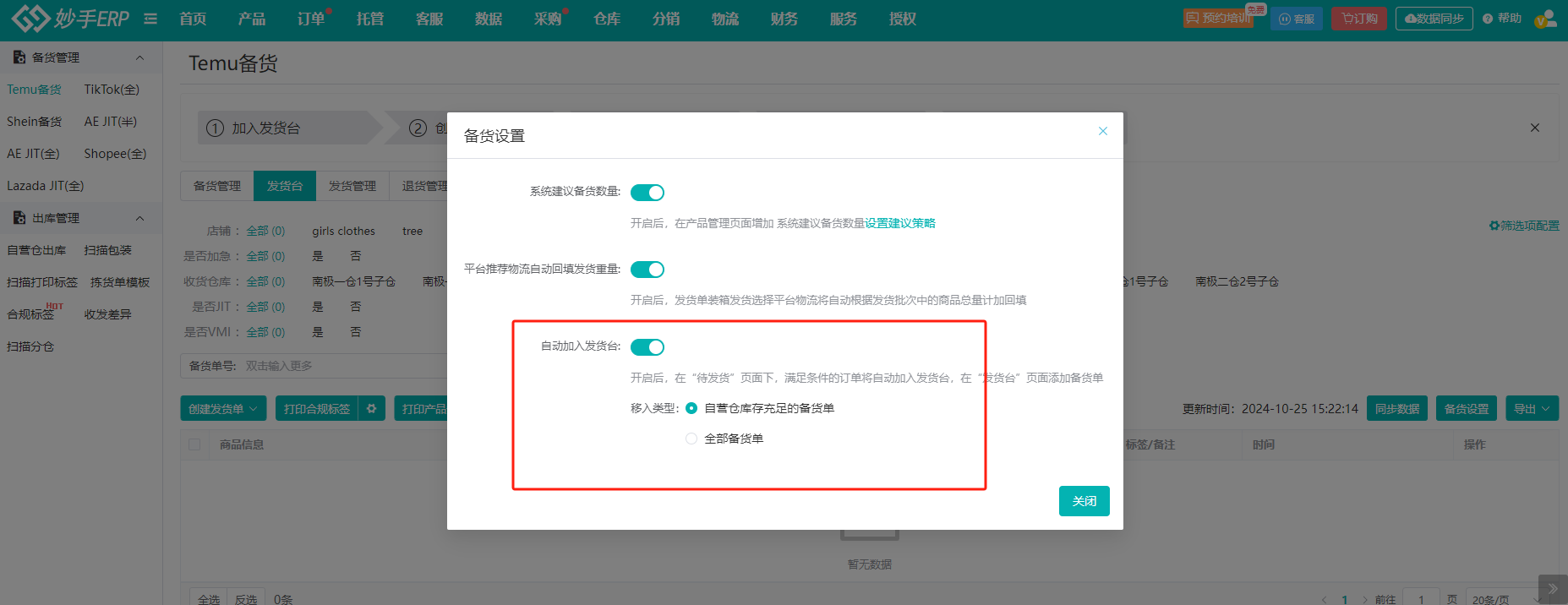 我是用妙手ERP的TEMU备货功能来抢发货台的,在妙手TEMU备货-备货设置中开启【自动抢发货台】按钮后,系统自动帮你按点蹲守,自动将符合条件的备货单加入发货台,无需卖家手动接单,减少人力、时间成本。