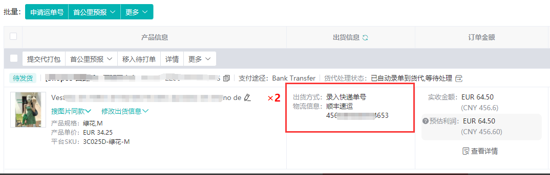 ③保存后,在“出货信息”列内会显示录入的信息,若您是录入快递单号,订单会自动同步至货代,您后续可在“待打单发货”状态查看货代处理订单的状态。