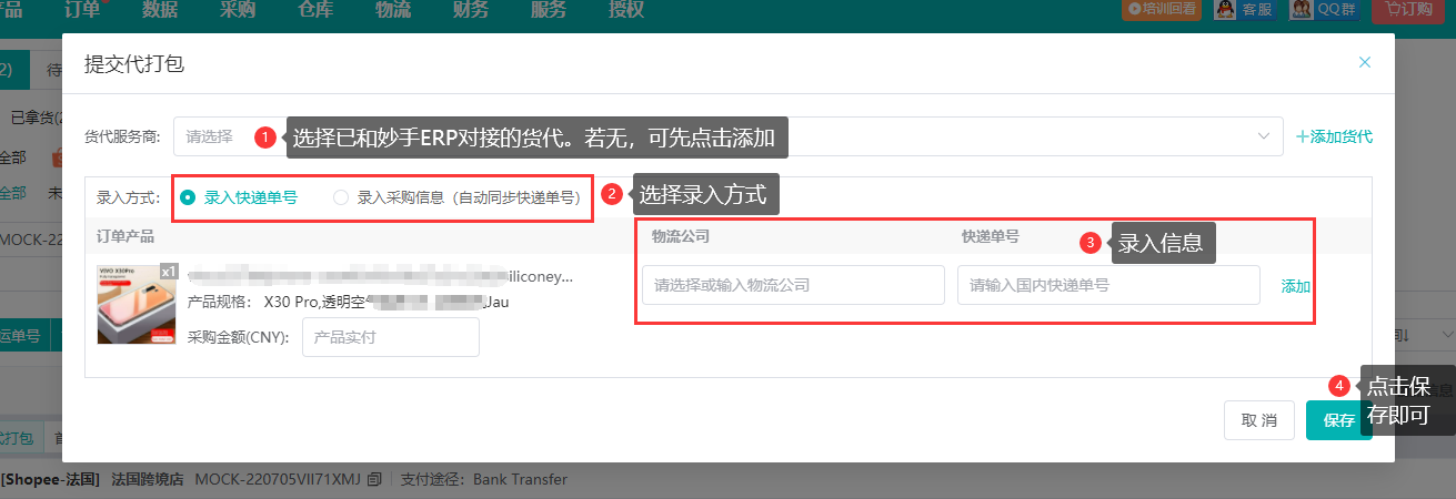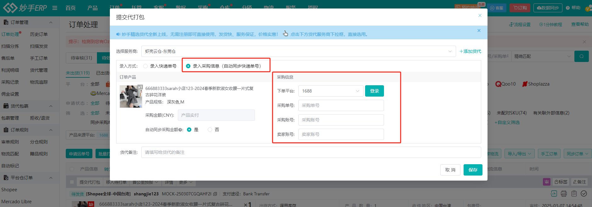 情况二:若您已通过其他渠道完成采购,或者自己有部分备货,直接发货到货代,可在妙手上录入代打包信息并同步至货代