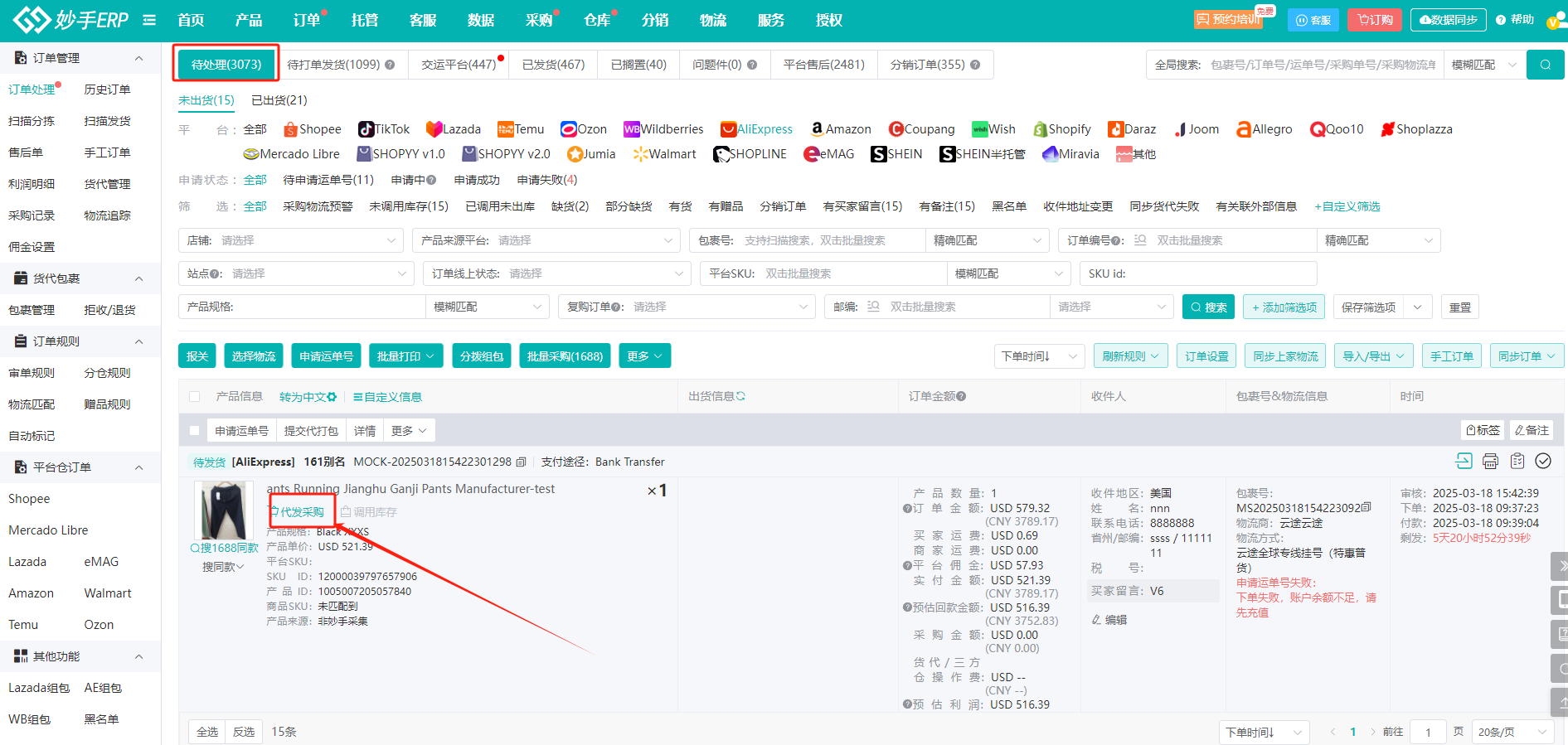 (1)进入妙手ERP=>订单=>订单处理,目前已授权平台的所有订单会汇总到这个界面中