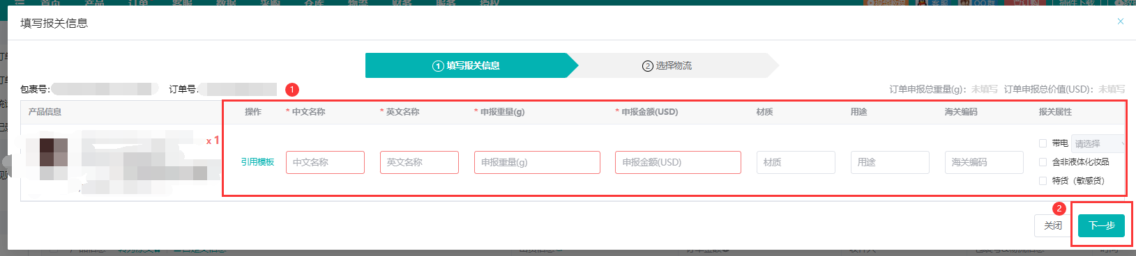 (2)在弹窗中,填写报关信息完成报关后,点击下一步