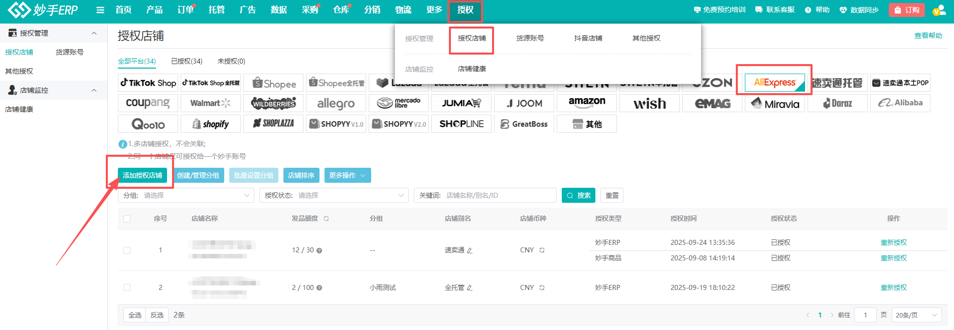 2、注册完账号进入妙手ERP--授权--授权店铺,选择AliExpress(速卖通)平台,点击添加授权店铺,将你的店铺授权至妙手。详细授权教程可点击查看:AliExpress(速卖通)店铺授权