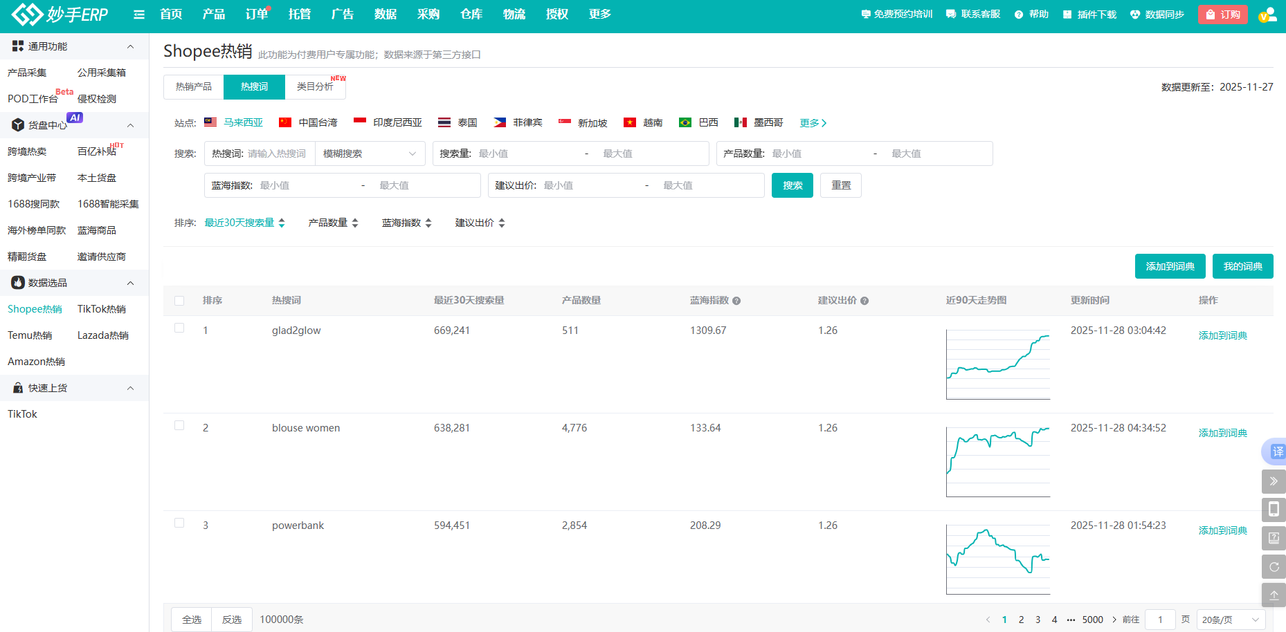 为简化多站点、多店铺卖家的运营链路,同样通过妙手ERP的Shopee热销功能,就能一“页”了然不同站点、不同类目的热销关键词,还可以通过搜索量、出价范围、蓝海指数等指标筛选热搜词等。