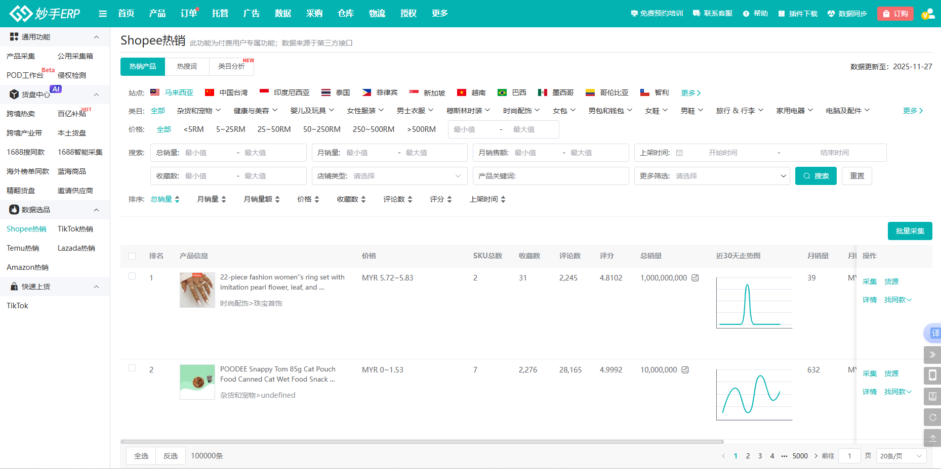 通过以上两个功能板块确定选品后,还可直接使用右侧功能一键采集到妙手ERP的采集箱,编辑后即可批量上架到自己的Shopee店铺,提升运营效率。