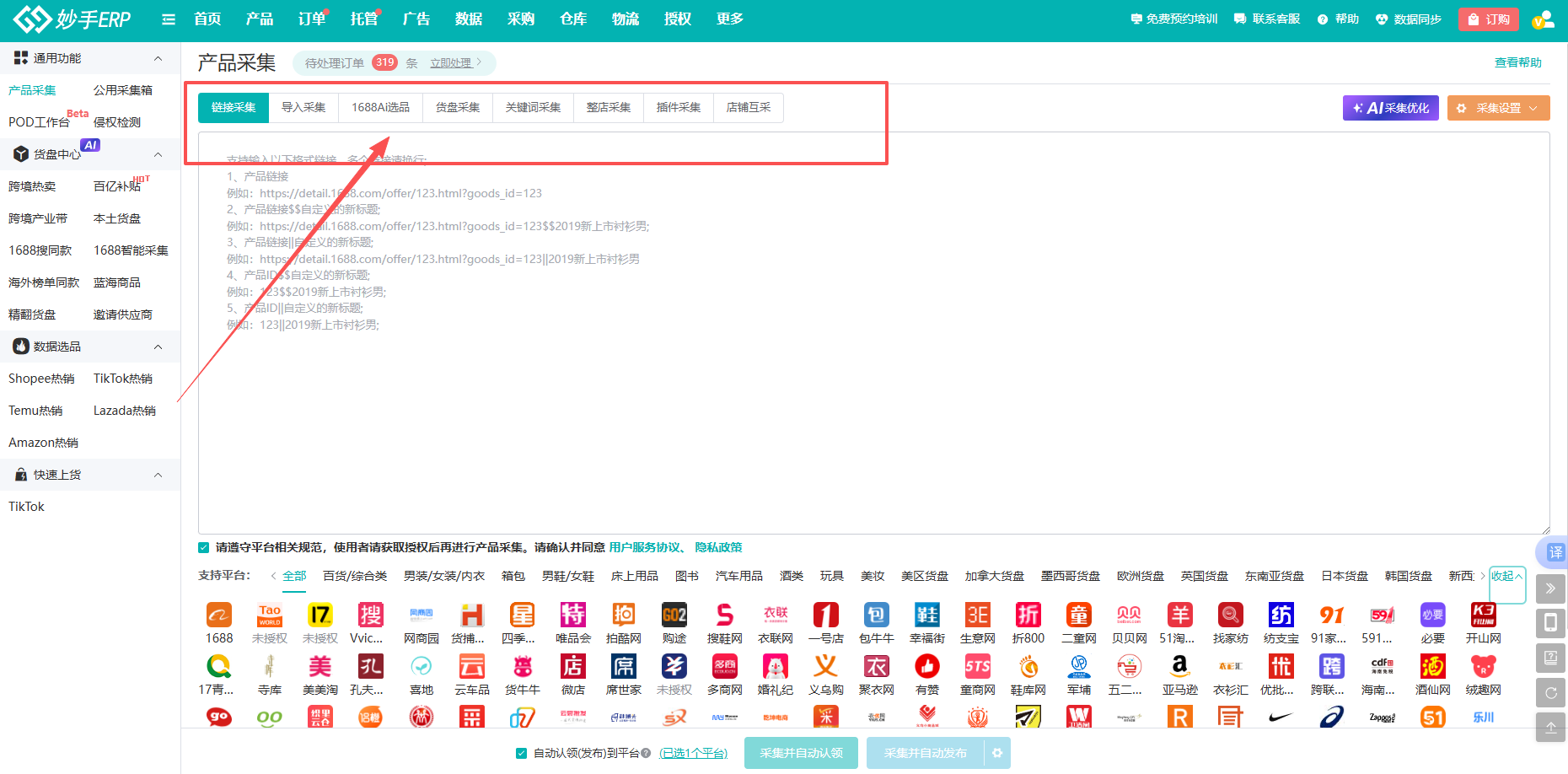 有了货源之后,能够快速采集产品,减少繁琐的操作也非常重要。很多ERP采集方式少,卖家朋友操作起来会觉得束手束脚。