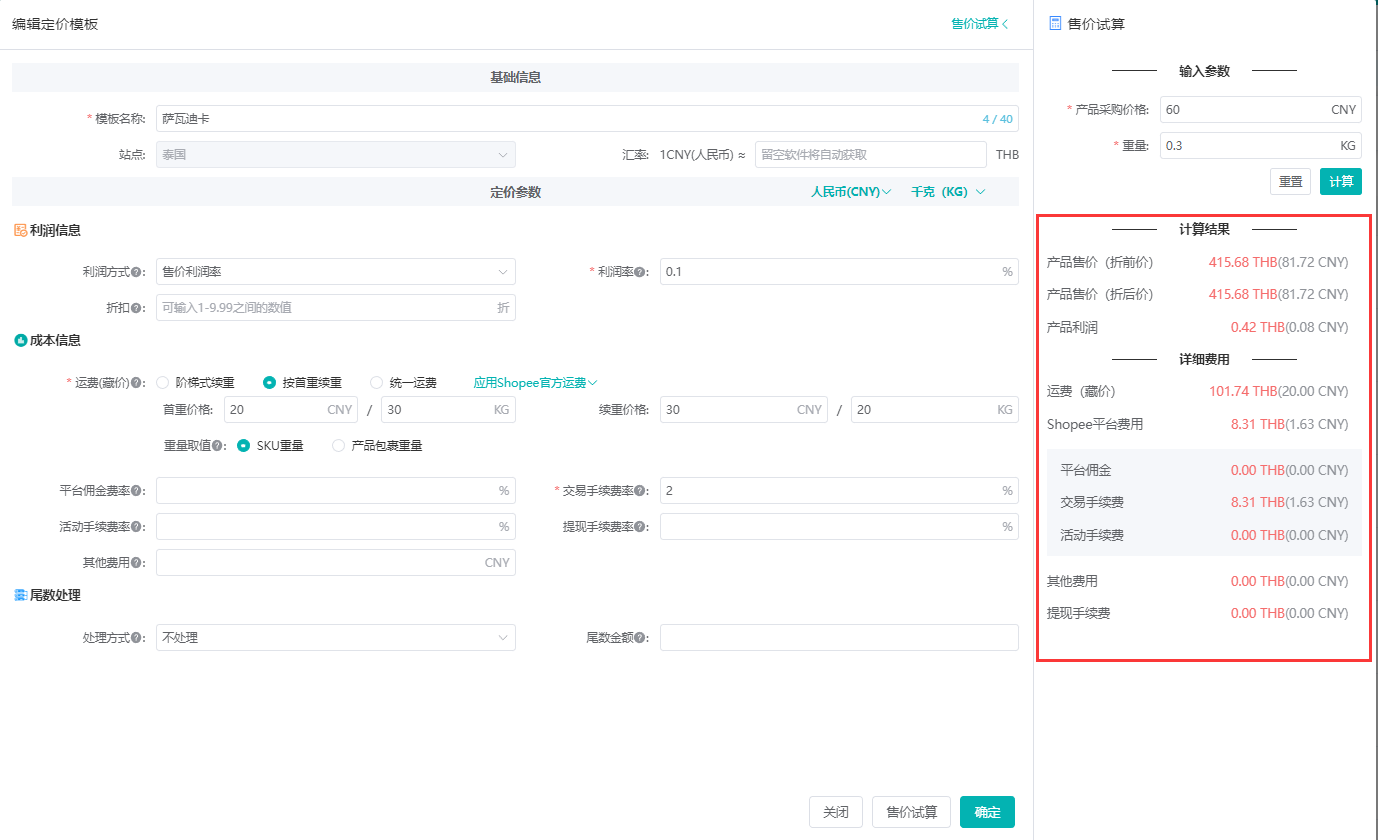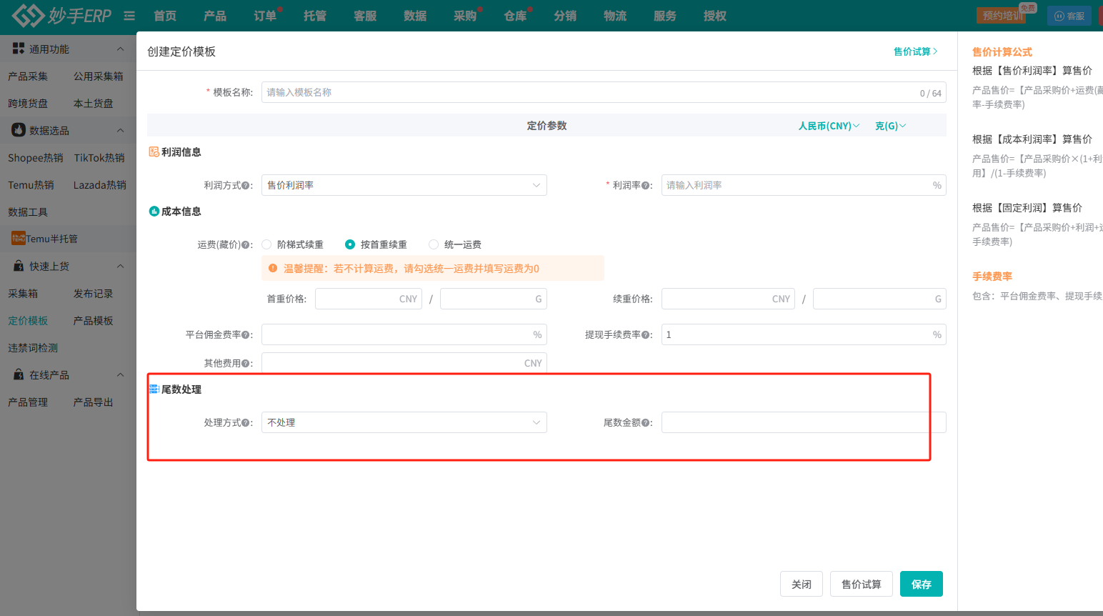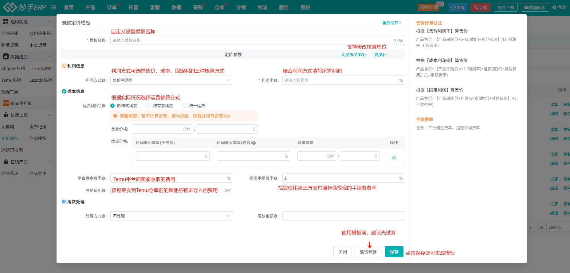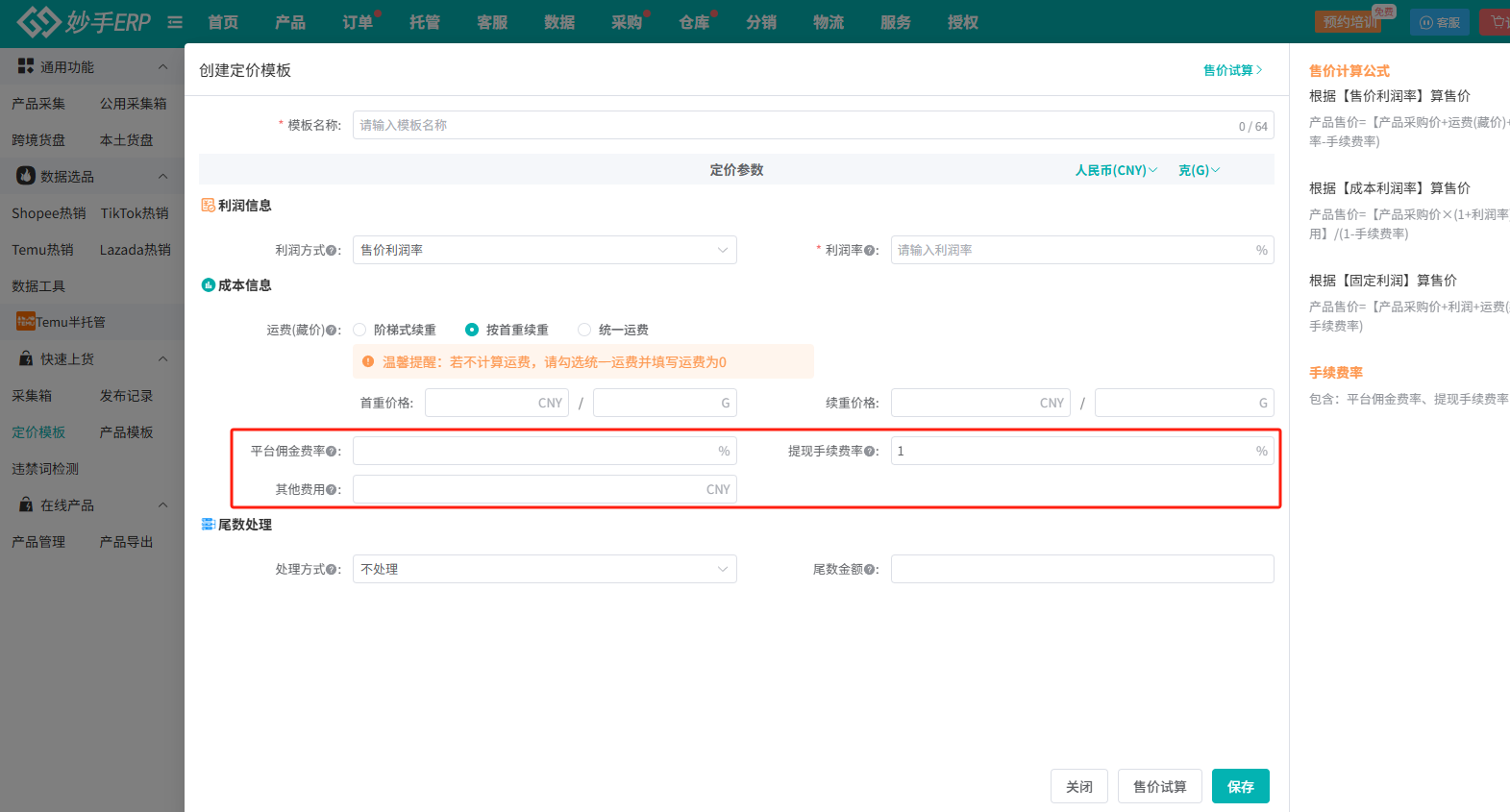 设置完所有参数后,别急着保存,妙手ERP还有个超实用的售价试算功能。先试算一下,看看系统算出来的Temu半托管和全托管的定价是否符合预期,比如成本10元、运费2元、利润5元,算出来的售价是不是在合理范围。如果觉得价格太高,就调整一下利润率;如果太低,就检查是不是运费填少了,试算没问题后再点保存,定价模板就创建好了。