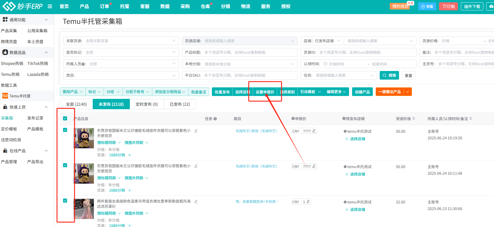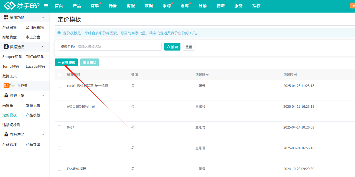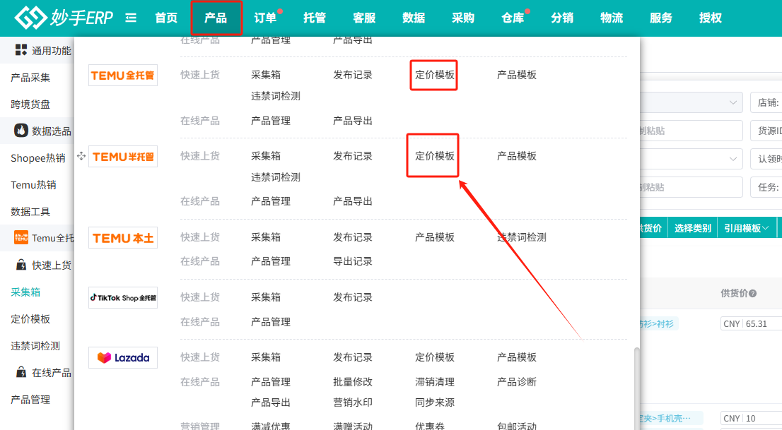 首先得进入妙手ERP的主界面,找到“产品”板块,然后根据自己做的模式,选择“Temu全托管”或“Temu半托管”入口,点进去就能看到【定价模板】的选项,这一步没啥技术含量,跟着界面指引走就不会错。