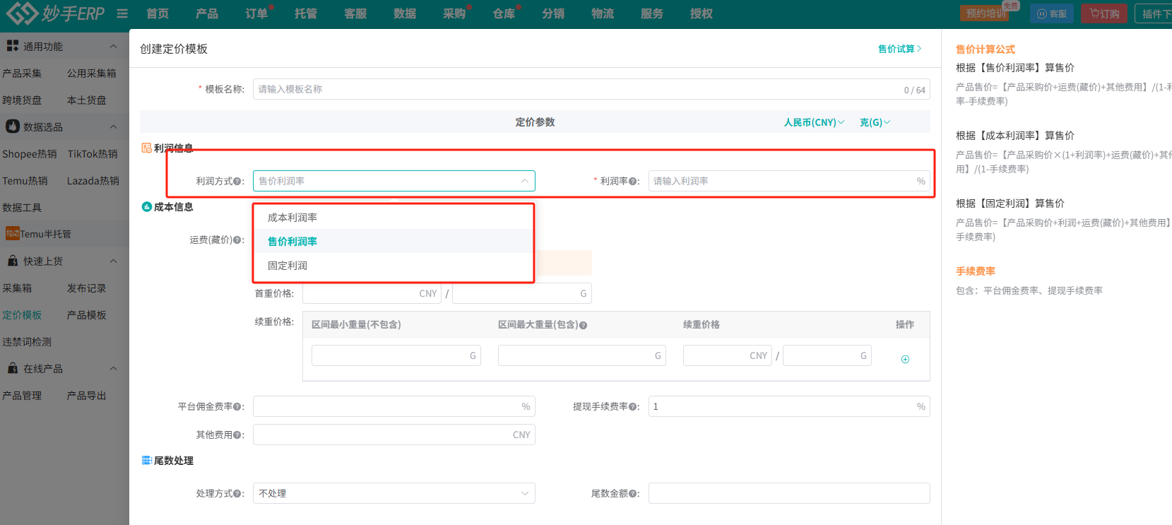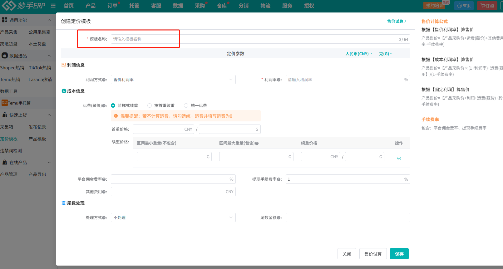 其实做Temu半托管和全托管的定价,难就难在“成本杂、算得慢、易出错”。不同站点的物流收费标准不一样,比如美国站首重8元/100克,欧洲站首重12元/100克,要是一个个商品去适配运费,光算物流成本就得花大半天。还有平台佣金、提现手续费这些固定成本,稍不注意就会漏掉,最后看似卖了不少货,实则根本没利润。更头疼的是多店铺运营时,每个店铺的品都要单独定价,效率低到离谱。而妙手ERP推出的定价模板功能,刚好解决了这个痛点——它把运费成本、交易成本等所有影响Temu半托管和全托管的定价的因素都整合进去,咱们只要设置好参数,系统就能自动批量算出售价,再也不用手动跟一堆数字较劲了。而且不管是做Temu半托管还是全托管,这个定价模板的创建流程几乎一模一样,上手特别快。