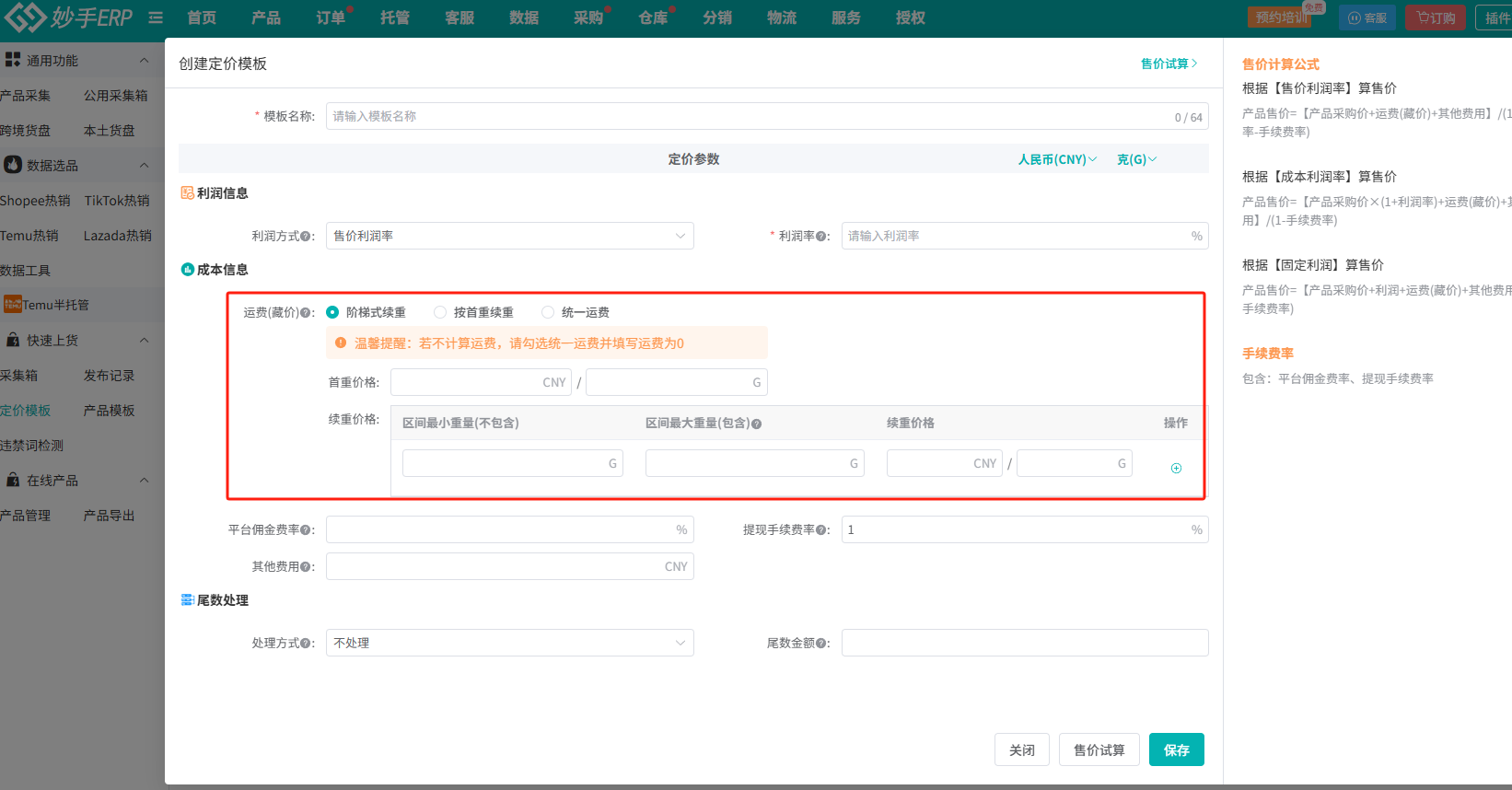 第二个是运费(藏价),这是做Temu半托管和全托管的定价时绝对不能忽略的点,说白了就是把咱们要承担的运费加到售价里,不然物流成本能直接吃光利润。妙手ERP里有三种运费计算方式:阶梯式续重、按首重续重、统一运费。