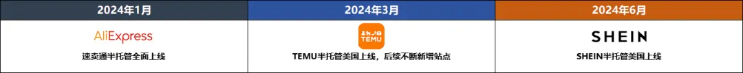 随后在2024年初,速卖通又推陈出新,率先推出了“半托管”模式,一时间又风起云涌,随后TEMU和SHEIN又陆续布局半托管: