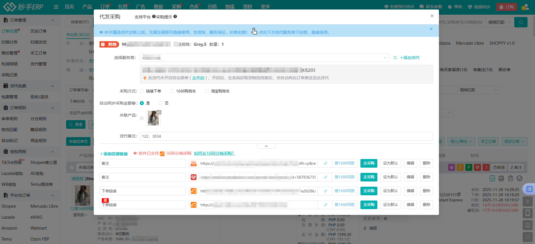 对于无货源卖家,妙手还支持勾选订单批量进行1688采购,无需跳转第三方货源平台,有效规避下单信息填写错误,并支持同步将订单推送给货代,后续相关物流也会同步到妙手,帮助卖家时时追踪包裹动态,无货源一件代发的秘籍全靠它!