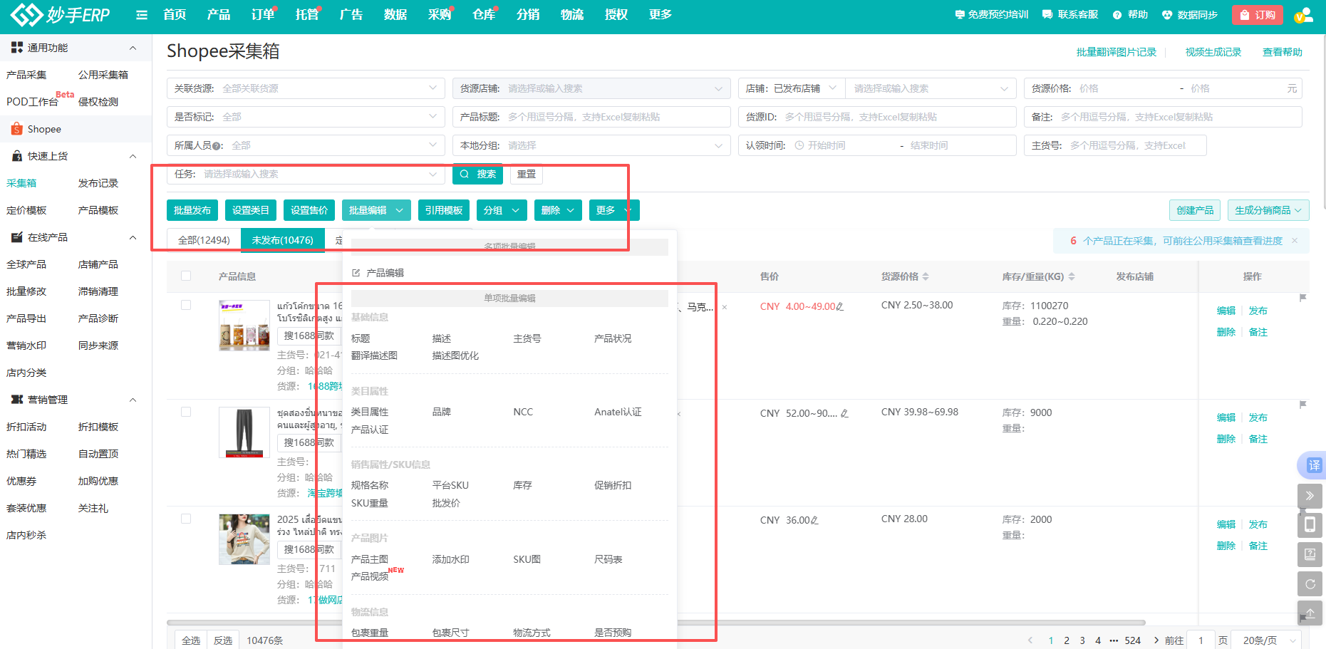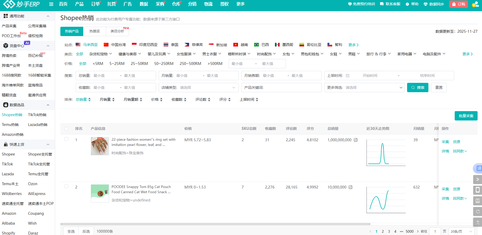 妙手为Shopee卖家提供了数据选品工具,支持卖家查看虾皮各站点热销产品,并可根据类目、价格、销量等维度快速筛选产品,帮助卖家朋友快速直达目标产品。同时,心仪产品可一键采集上货到店铺,热销品也能轻松上架到店铺。