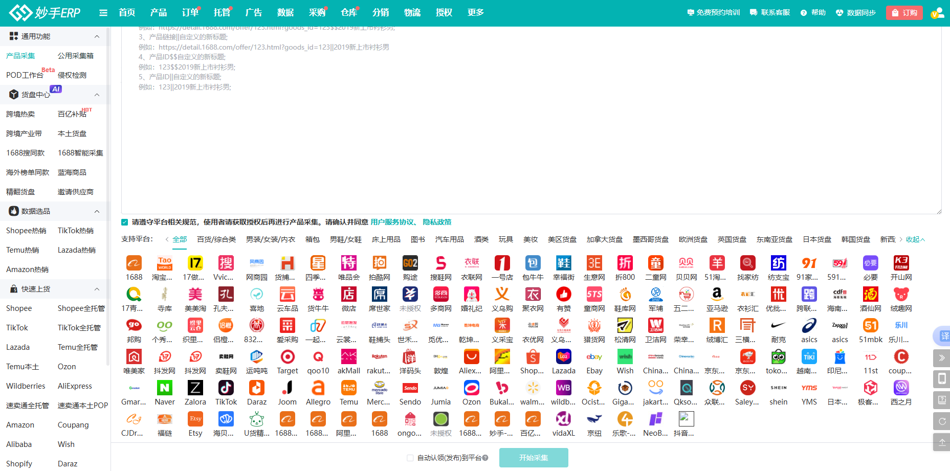妙手支持关键词、链接、插件、整店等7种采集方式,快速采集100+国内外货源平台产品,平台涵盖1688、Lazada、TikTok小店等,解决卖家货源烦恼。