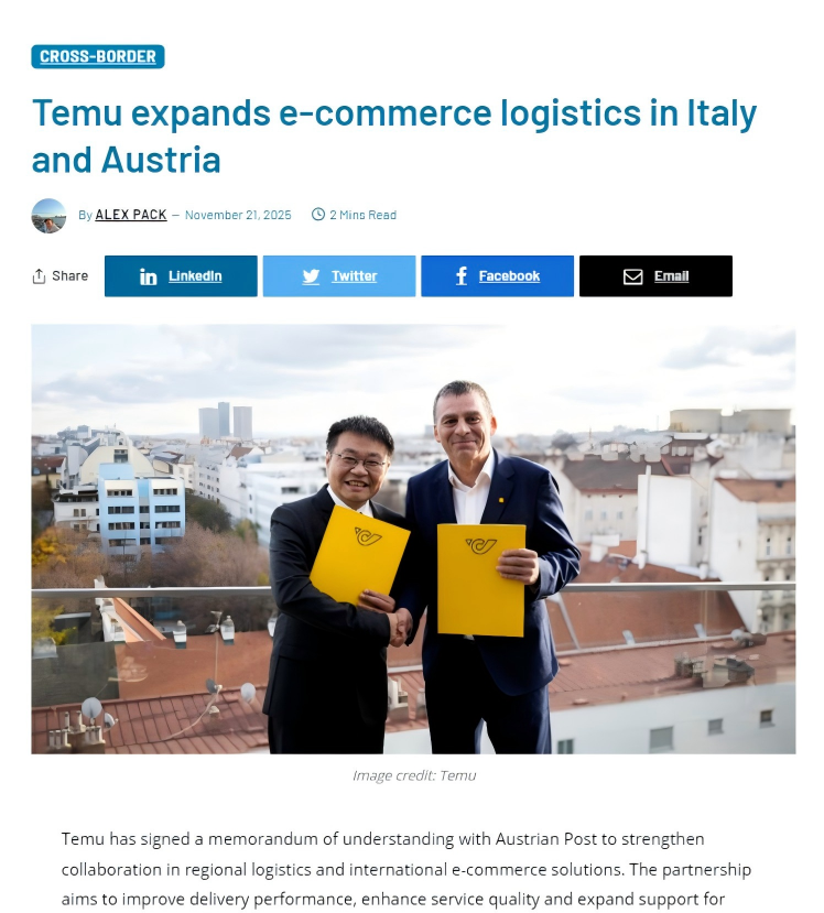 而且为了吸引更多具备做半托管能力的中大型卖家做正式入驻前的过渡和测品尝试,Temu一刻不停地加强本地履约,在近期正式宣布与意大利邮政、奥地利邮政及其旗下 Express One、Aras Kargo 达成合作,签署合作备忘录,加码欧洲物流网络布局,这波操作,对Y2模式来说也是利好。