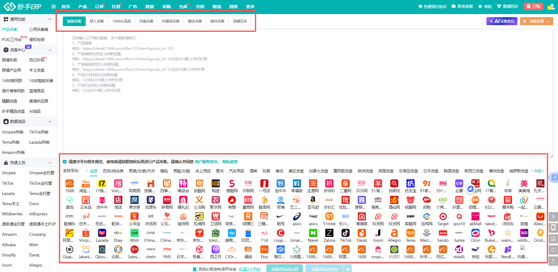 推荐妙手ERP,它支持Temu拼多多跨境上货,而且上货方式多,可以用关键词、链接、插件、整店等多种采集方式,采集1688等100+货源平台上货,在妙手ERP点击货源平台的logo就可以直接跳转相应平台上货,非常简单好用。