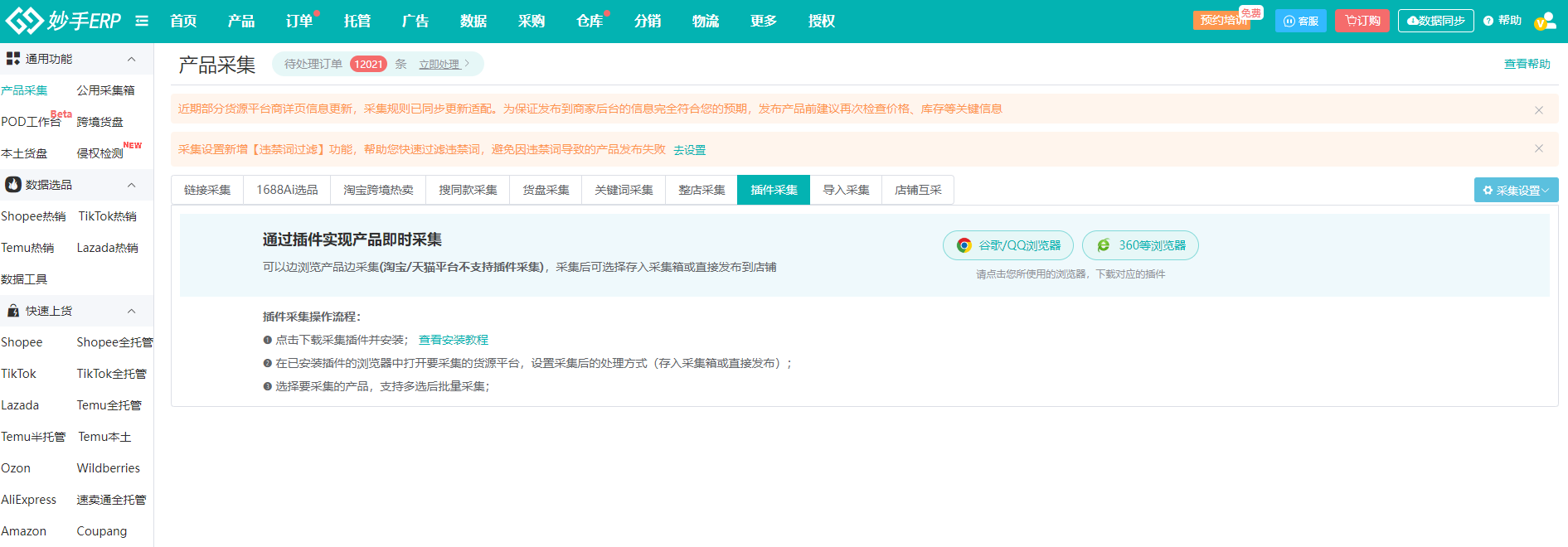 使用插件采集需要先安装插件,如何安装插件,妙手ERP会有教程教你操作。