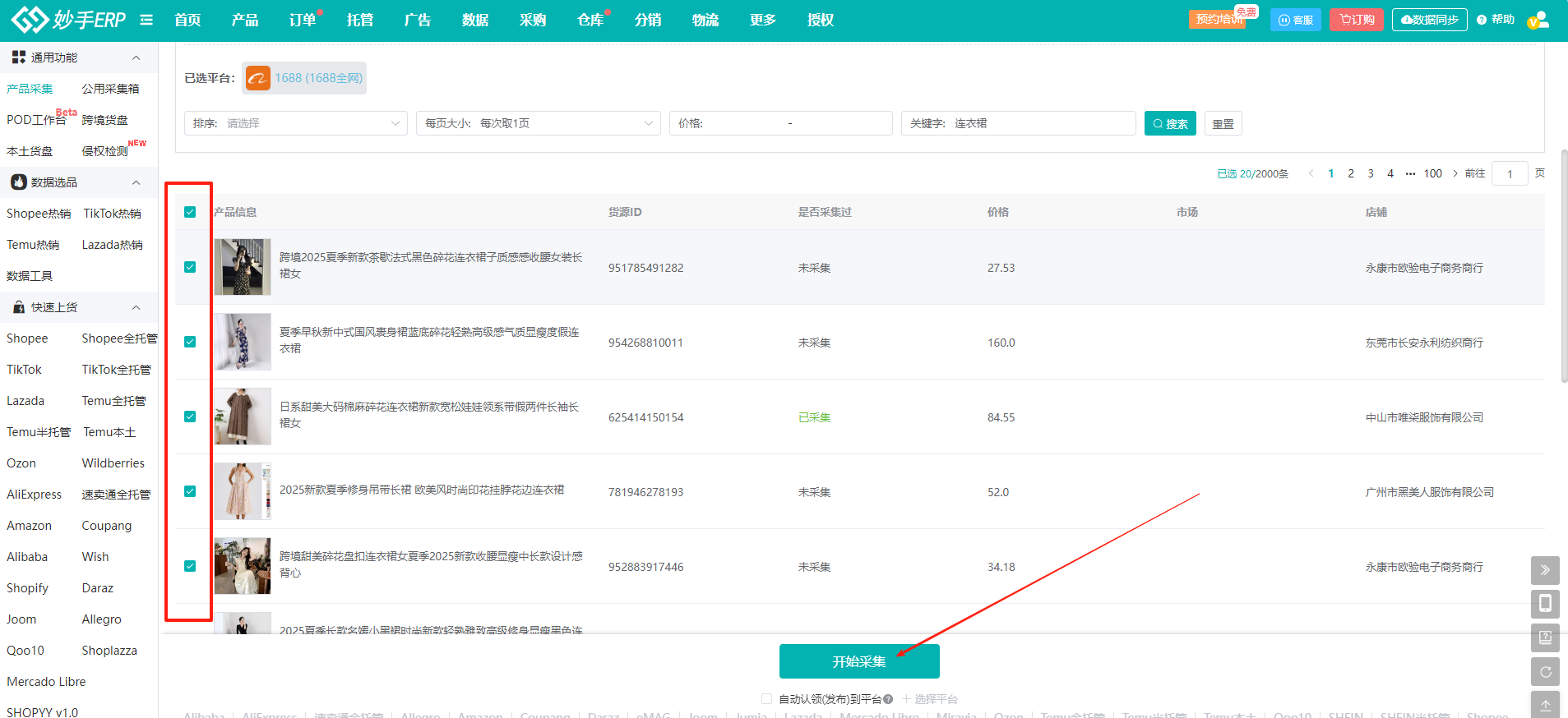在关键词采集的功能界面中,输入1688产品关键词后,会在妙手ERP中显示产品,勾选需要采集的产品,点击【开始采集】即可