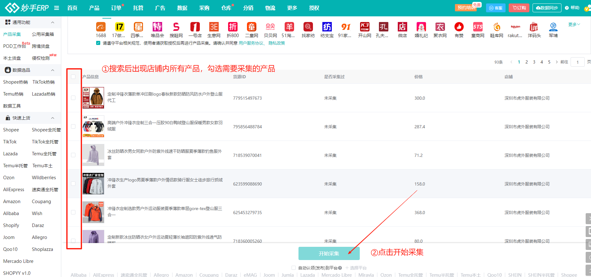 进入1688店铺的首页,复制首页链接到妙手ERP后,勾选需要采集的产品,即可开始采集