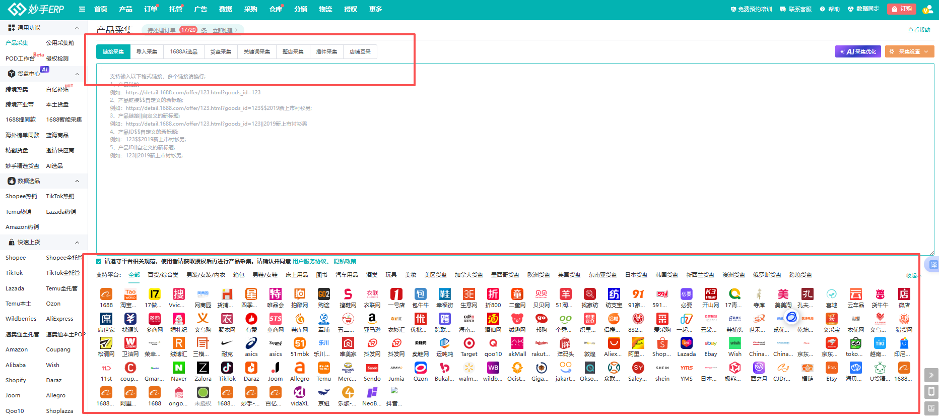 妙手ERP支持关键词、链接、插件、整店等多种采集方式,可以采集1688等100+国内外货源平台产品,且点击各平台头像就可以直接跳转相应平台,解决了卖家的货源烦恼。