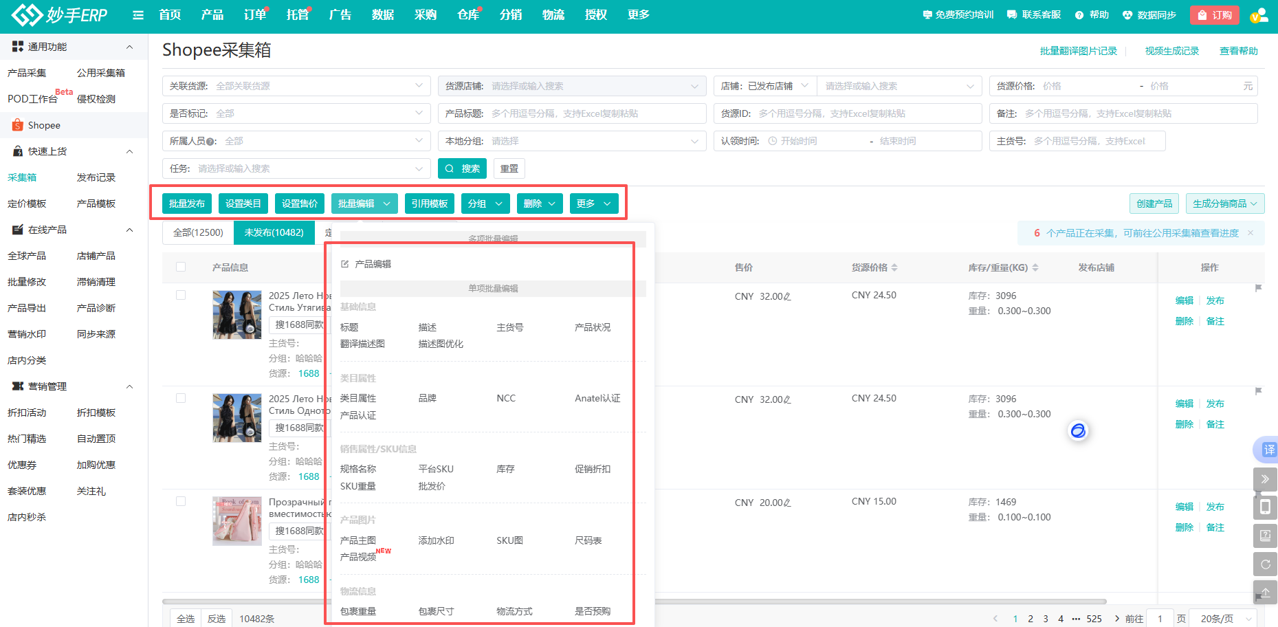 采集完之后,妙手ERP还支持批量修改产品信息、价格、设置站点类目等;同时,也支持单品精细化编辑,单品编辑里可以对产品进行AI智能生产优质标题、描述,图文一键翻译等。等你产品信息全部修改完成后,就可以试用妙手ERP批量定时发布到各个虾皮Shopee店铺,非常方便。