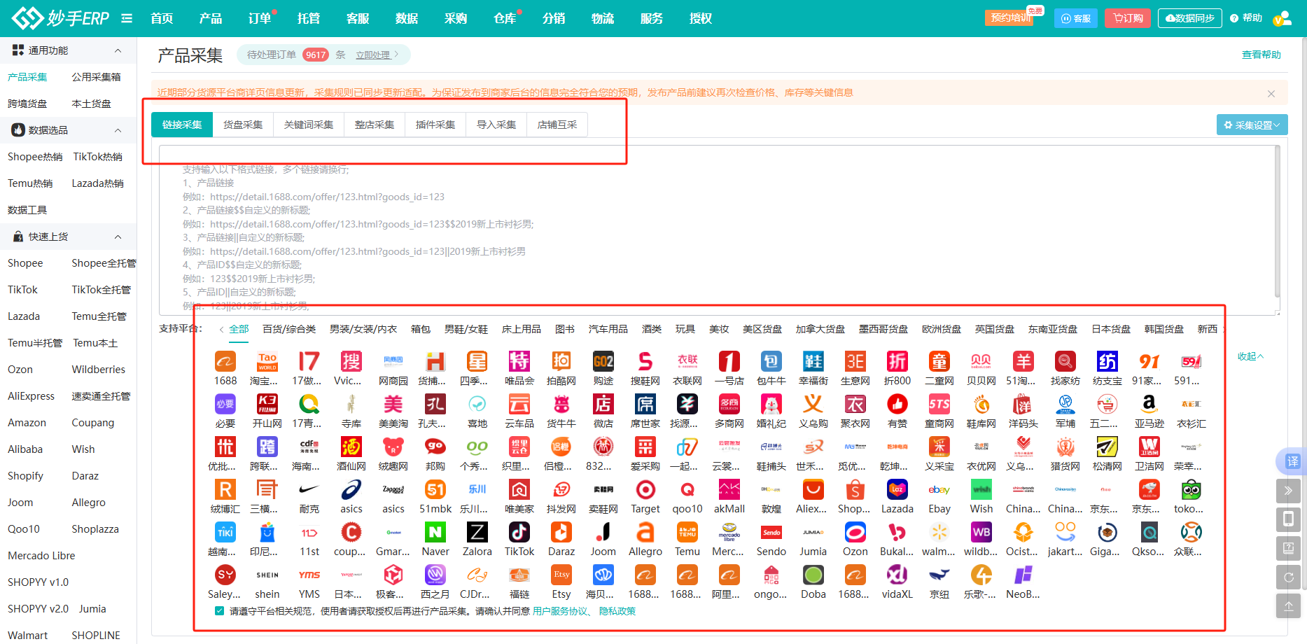 妙手ERP可以使用关键词、链接、插件、整店等方式,去采集1688、WB野莓等100+国内外货源平台的产品。大家可在产品模块-产品采集页面,选择上面的采集方式,再点击下方平台logo就会跳转相应平台,之后进行采集即可。