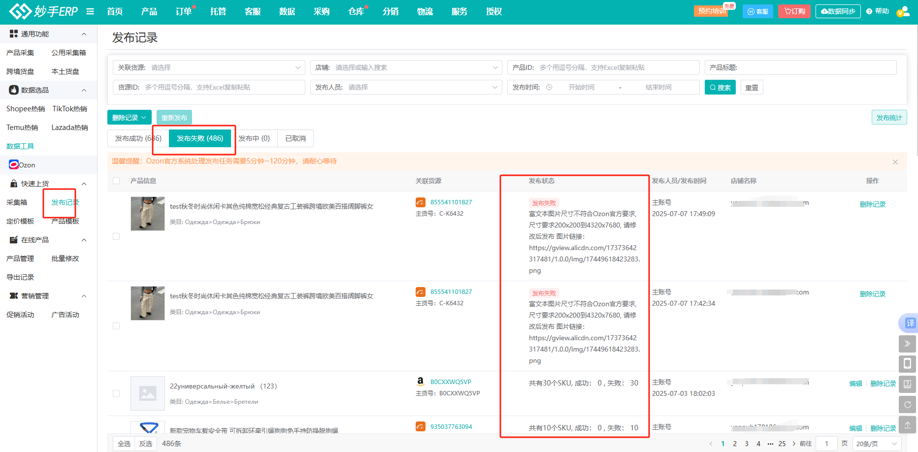 (2)后续可在发布记录中查看是否发布成功,成功的产品会自动上架到Ozon店铺,失败的产品妙手会提示失败原因,大家按照提示重新修改再发布即可。