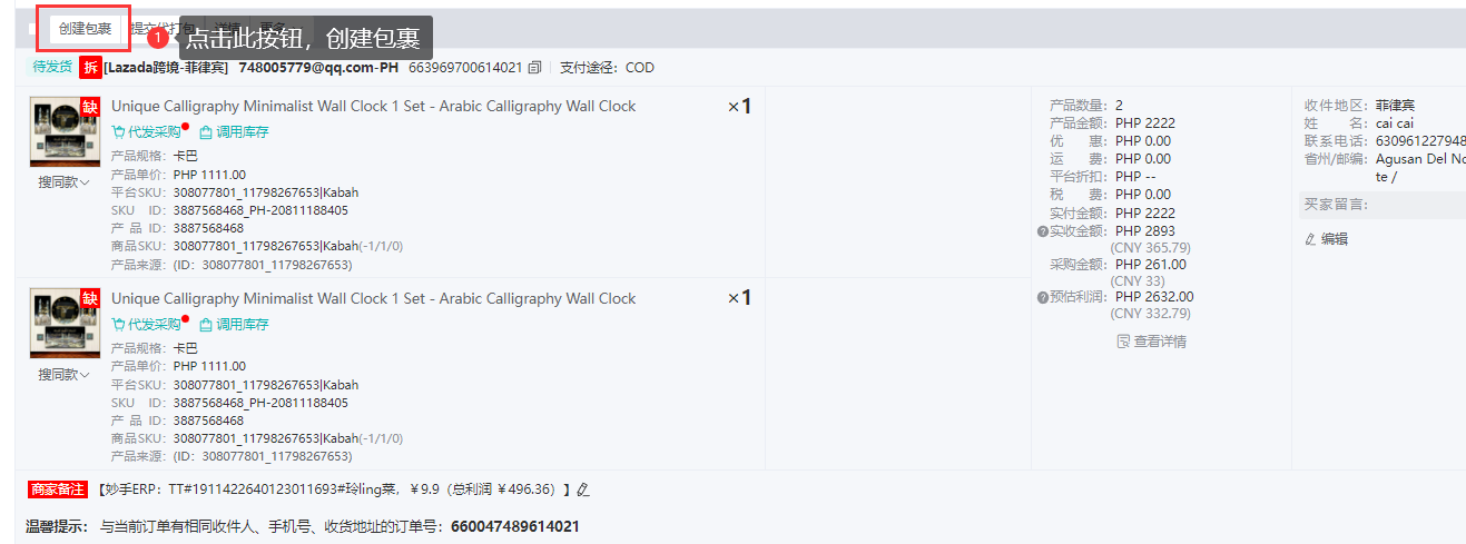 (1)仍然在“待处理”页面,点击【创建包裹】